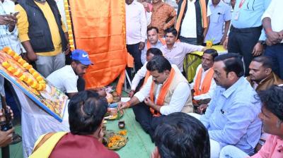 कृषि मंत्री नेताम ने मिट्टी एवं बीजों की पूजा की और ट्रैक्टर चलाकर बीजों की बुआई की